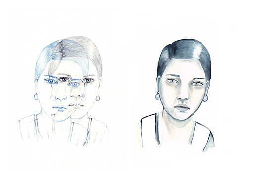 Bleistift, Farbstift, Tusche auf Aquarell, 42 x 25,5 cm