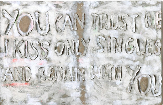 o.T. (YOU CAN TRUST ME / I KISS ONLY SINGLES AND REMAIN WITH YOU), 2012, Acrylfarbe, Draht, Fluo-Vinylfarbe, Kasein, Leinwand, Metalleffektpigment, Phosphoreszierendes Pigment, Pigment auf Leinwand, 150 x 230 cm